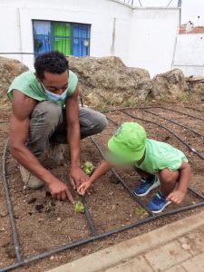 - É preciso plantar, regar, cuidar e colher os legumes para depois os podermos comer! Aqui estamos a plantar belas alfaces!